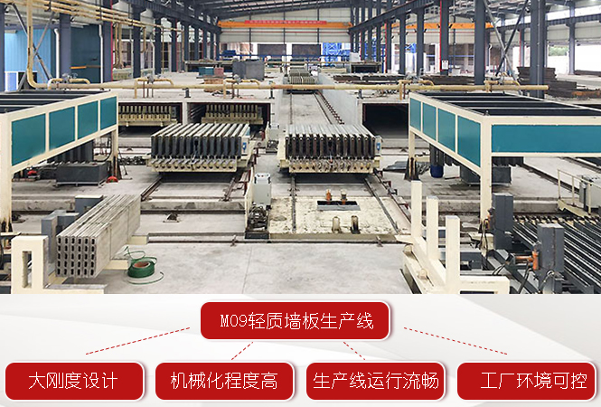 為解決這一問題滿足市場需求,瑪納公司經過技術創新,采用成組立模成型技術(系瑪納公司原始技術創新成果),研制出了M09輕質墻板生產線,該生產線主要生產新型輕質條板,實現了菱鎂隔墻板的自動化生產。